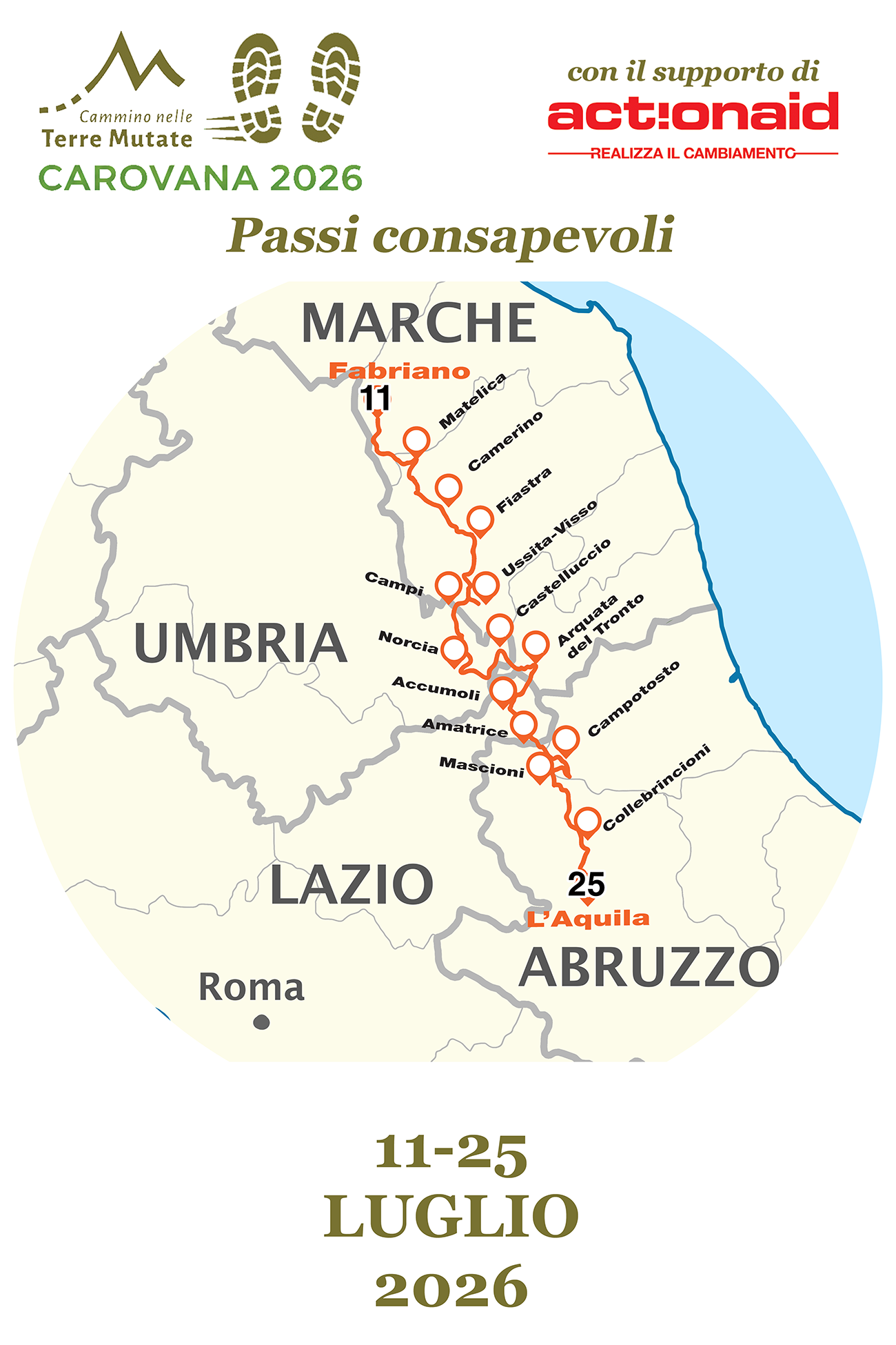 Da Fabriano a L’Aquila, l’itinerario attraversa i territori ed entra in contatto con le comunità di quattro regioni del Centro Italia (Marche, Umbria, Lazio, Abruzzo), lungo i sentieri escursionistici e ciclabili di due importanti aree protette: il Parco Nazionale dei Monti Sibillini e il Parco Nazionale Gran Sasso e Monti della Laga.